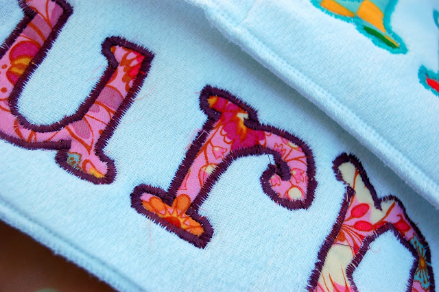 4.) Peel the paper off the back of your letters, and iron them onto the burp cloths.