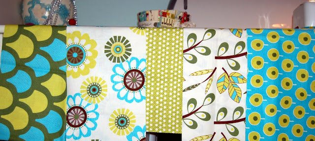 Using only 1 of the piles, I laid them out in the order I wanted them to fall, and then sewed the 5 long strips together to make 1 long skinny quilt top.