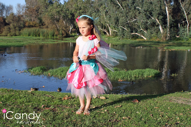 So I draped a little sparkly turquoise onto the leotard, added some burnt satin flowers to the shoulder, made a tie-tutu (which was really fun and so easy!) and a petal overskirt, with turquoise leaves. I found a sparkly butterfly that I added to the skirt.